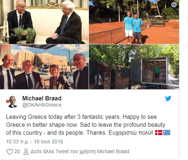 Φανταστική χαρακτήρισε την τριετή θητεία του στην Ελλάδα, ως πρεσβευτής της Δανίας στη χώρα μας και την Κύπρο, ο Μίχαελ Μπράαντ (Michael Braad). Σε ανάρτησή του στον προσωπικό του λογαριασμό στο Twitter με αφορμή την ολοκλήρωση της θητείας του στην Ελλάδα.