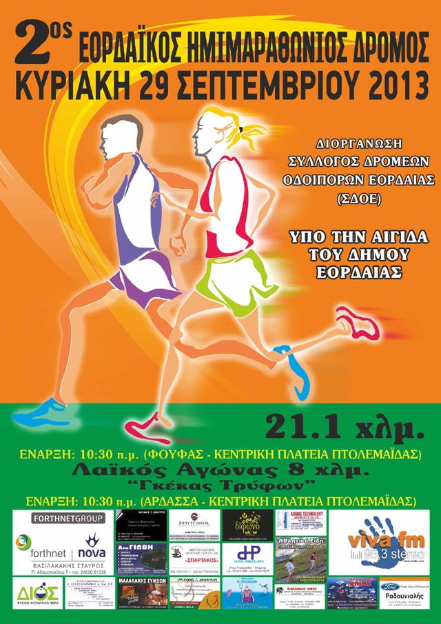 Μετά από την πρώτη επιτυχημένη διοργάνωση ο Σύλλογος Δρομέων Οδοιπόρων Εορδαίας σε συνεργασία με το Δήμο Εορδαίας, με τοπικούς, πολιτιστικούς, αθλητικούς και άλλους φορείς, διοργανώνει την Κυριακή 29 Σεπτεμβρίου 2013 και ώρα 10:30 τον 2ο Εορδαικό ημιμαραθώνιο δρόμο, καθώς επίσης και μαζικό λαϊκό δρόμο 8.000 μέτρων «ΓΚΕΚΑΣ ΤΡΥΦΩΝ» εις μνήμη του αγαπημένου μας συναθλητή.