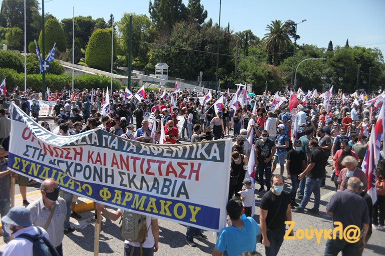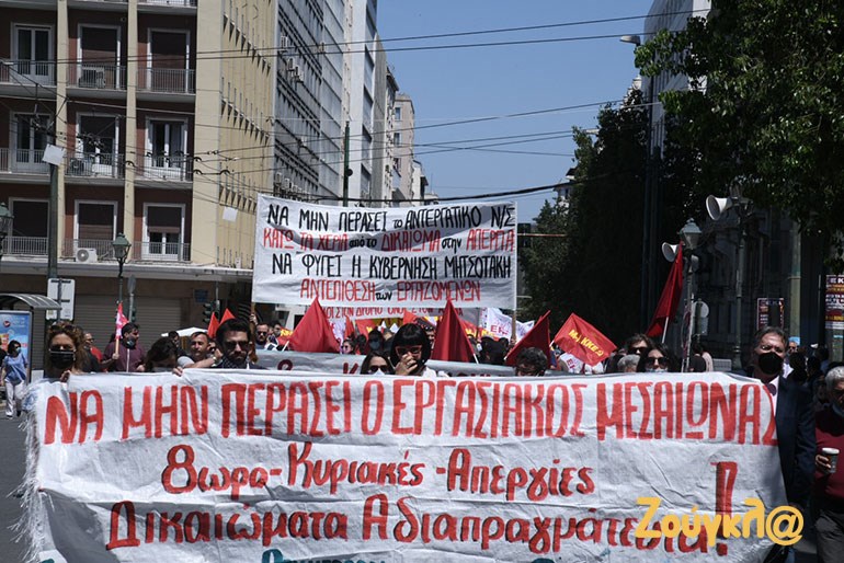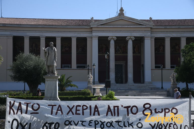 Η ΑΔΕΔΥ, το ΕΚΑ, εργατικά σωματεία, σύλλογοι εργαζομένων, φορείς και οργανώσεις της Αριστεράς, συγκεντρώθηκαν λίγο μετά τις 6μμ, στο Σύνταγμα, διεκδικώντας την απόσυρση του νομοσχεδίου. Με κεντρικό σύνθημα «Κάτω τα χέρια από το οκτάωρο» και «να μην περάσει το αντεργατικό νομοσχέδιο», οι διαδηλωτές και οι διαδηλώτριες αντιδρούν σε μια σειρά από τις αλλαγές που προβλέπονται.
