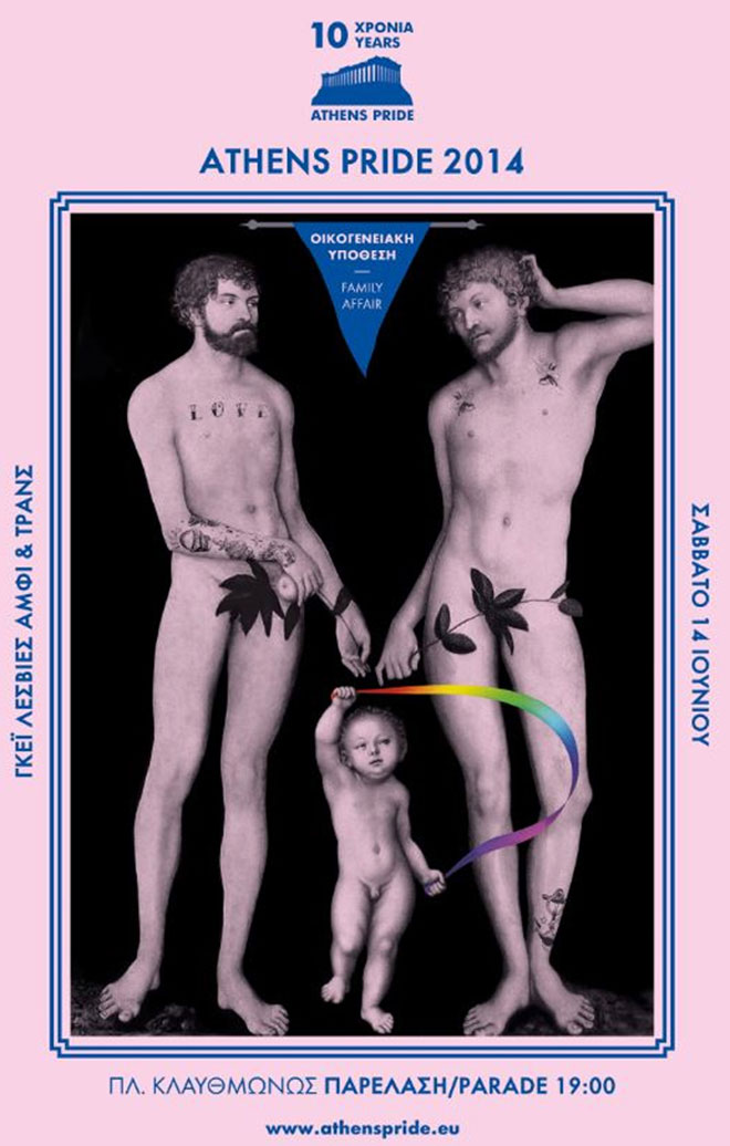 Με το σύνθημα «Οικογενειακή Υπόθεση» το Athens Pride 2014 επισημαίνει την ιδιαίτερη έννοια τις οικογένειας και προβάλλει στην αφίσα του το αρχετυπικό ζευγάρι, ως Αδάμ και Αδάμ, ενωμένους, με το παιδί τους, τον Έρωτα, σαν ένα παράδειγμα ομοφυλόφιλης οικογένειας.