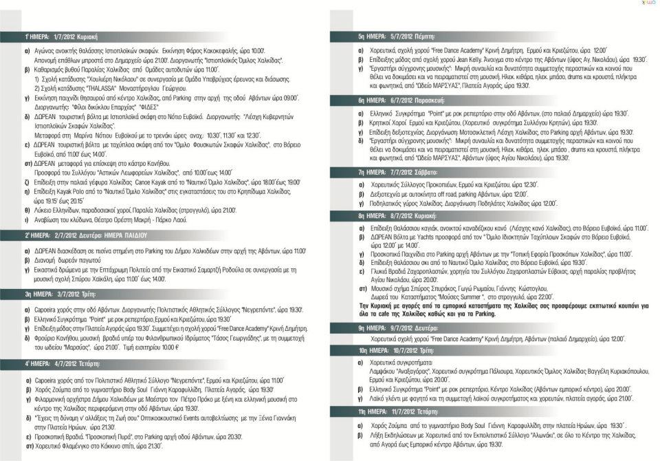 Πρόκειται για ένα 11ημερο (1 – 11 Ιουλίου 2012) πρόγραμμα εκδηλώσεων για όλες τις ηλικίες, το οποίο θα περιλαμβάνει δωρεάν βόλτες με φουσκωτά, αθλοπαιδιές, παραδοσιακούς χορούς, ενώ από το «μενού» δεν θα λείπει και η διανομή εδεσμάτων και γλυκών.