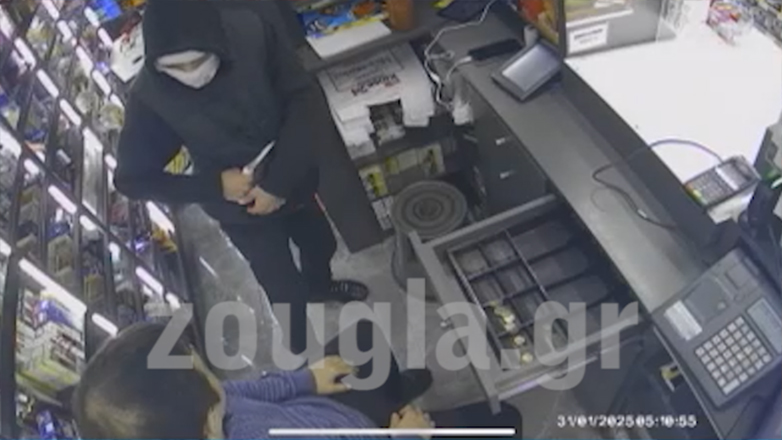 Όπως φαίνεται και στο βίντεο, κράδαινε ένα μαχαίρι πάνω από το κεφάλι του ιδιοκτήτη και όταν εκείνος έκανε βήματα πίσω άνοιγε την ταμειακή μηχανή, άρπαζε τα χρήματα και εξαφανιζόταν.