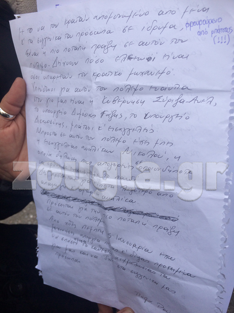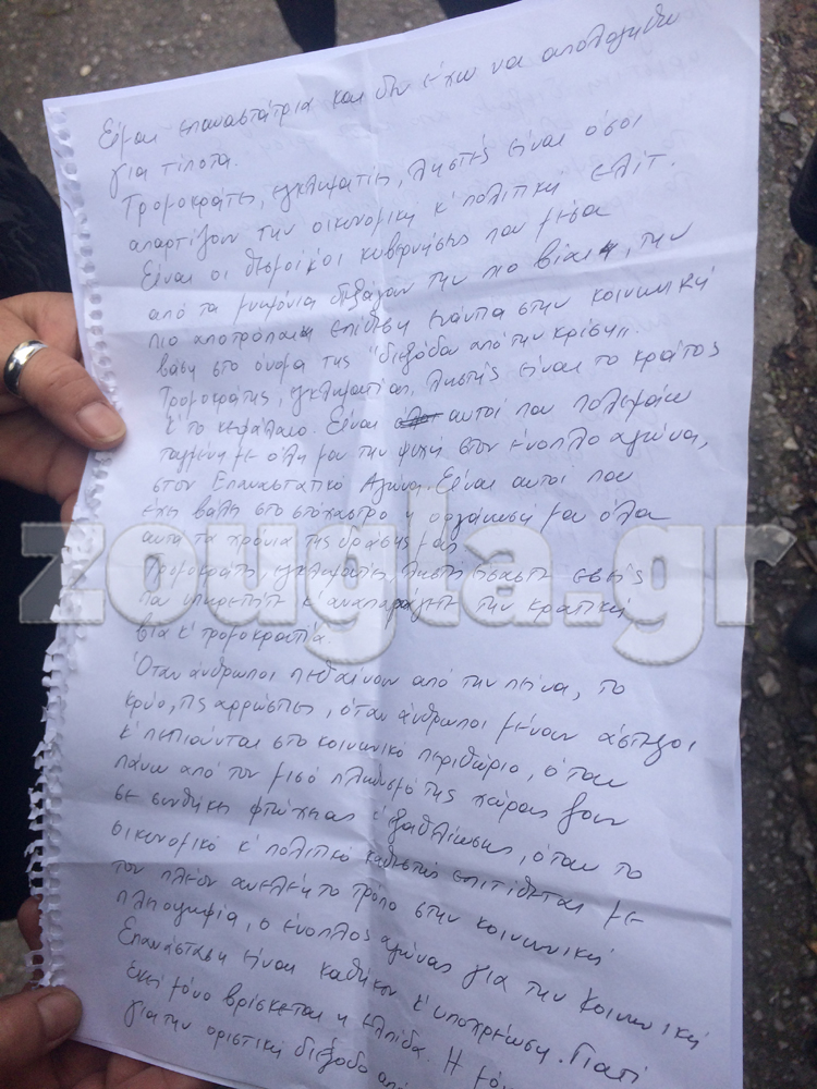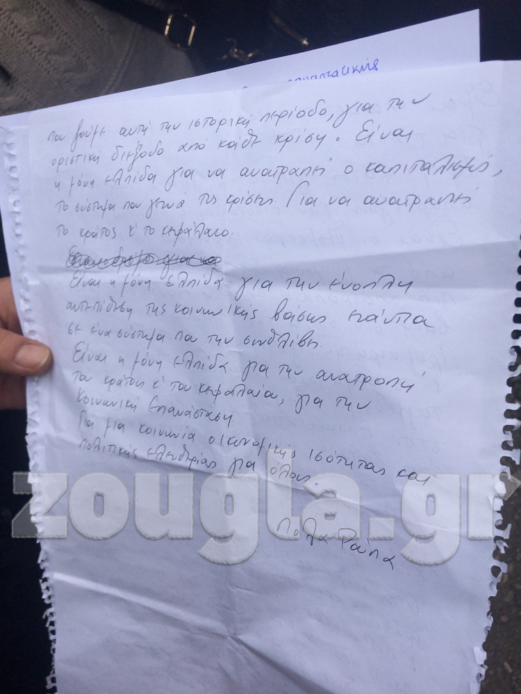 «Είμαι επαναστάτρια και δεν έχω να απολογηθώ για τίποτα» αναφέρει καταγγέλλοντας ότι «τρομοκράτες εγκληματίες και ληστές είναι όσοι απαρτίζουν την οικονομική ελίτ. Είναι οι θεσμοί και οι κυβερνήσεις που μέσα από τα μνημόνια διεξάγουν την πιο βίαιη , την πιο αποτρόπαια επίθεση ενάντια στην κοινωνική βάση στο όνομα της “εξόδου από την κρίση…”».