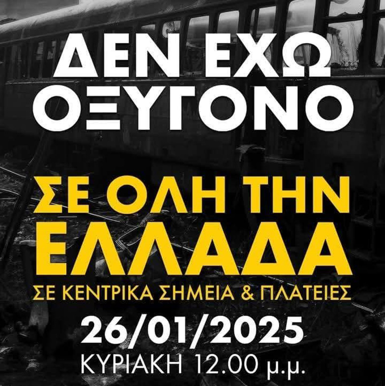 Τα συνθήματα «Δεν έχω οξυγόνο» και «Κανένα έγκλημα χωρίς τιμωρία» αναμένεται να ηχήσουν σε όλη τη χώρα την Κυριακή (26/1) από φορείς, συλλόγους, οργανώσεις και απλούς πολίτες που πραγματοποιούν κινητοποιήσεις σε όλη την Ελλάδα για το σιδηροδρομικό έγκλημα στα Τέμπη.