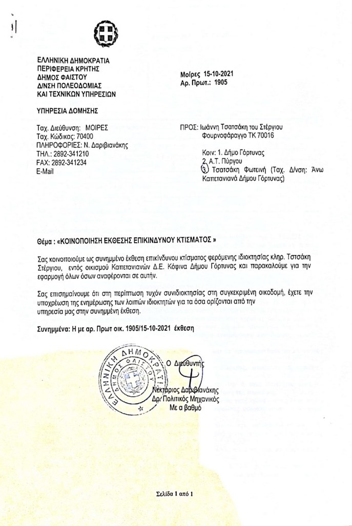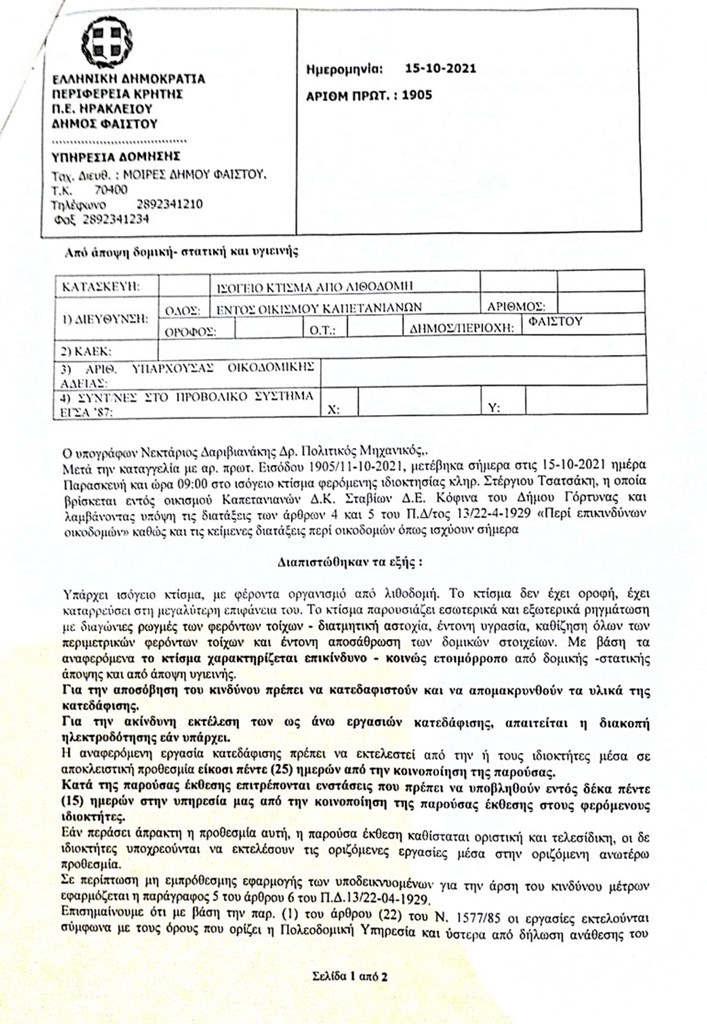 Μάλιστα ανάμεσα στα έγγραφα με τα οποία στοιχειοθετεί την καταγγελία του, υπάρχει η επίσημη απόφαση κατεδάφισης του συγκεκριμένου οικήματος και απομάκρυνσης των υλικών που εκδόθηκε στις 15 Οκτωβρίου 2021 υπογεγραμμένη από τον αρμόδιο πολιτικό μηχανικό, και δίνει προθεσμία 25 ημερών για την κατεδάφισή του.