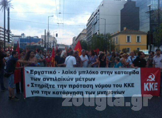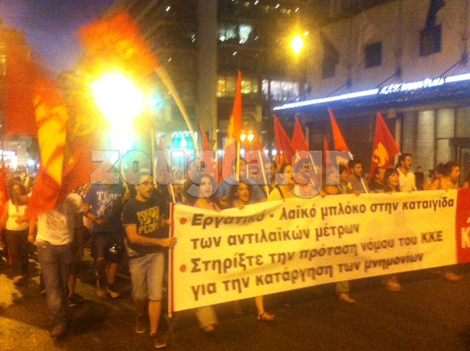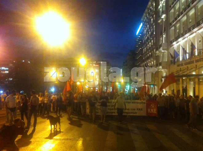 Στα Προπύλαια συγκεντρώθηκαν εκατοντάδες μέλη του ΚΚΕ και του ΠΑΜΕ. Στις 18:58 ξεκίνησε η πορεία μέσω της Σταδίο. Στις 19:54 η κεφαλή της πορείας βρισκόταν στα Προπύλαια. Η διαδρομή που ακολούθησαν ήταν «Προπύλαια-Σταδίου-Σύνταγμα και μέσω Πανεπιστημίου στην Ομόνοια». Η πορεία ολοκληρώθηκε στις 20:00.