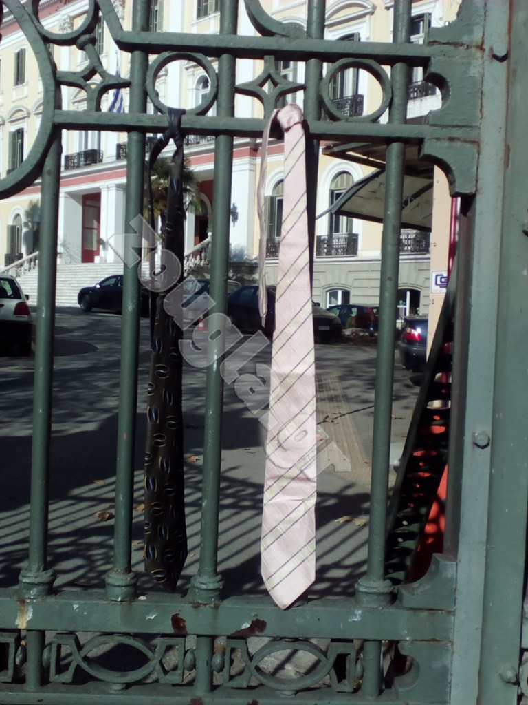 Γραβάτες στην καγκελόπορτα της κεντρικής εισόδου του Υπουργείου Μακεδονίας – Θράκης κρέμασαν το μεσημέρι της Τρίτης ελεύθεροι επαγγελματίες και μέλη επιστημονικών φορέων στο πλαίσιο διαμαρτυρίας τους για τις προωθούμενες αλλαγές στην κοινωνική ασφάλιση και το φορολογικό.