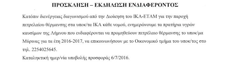 Κάλεσμα προς τα πρατήρια υγρών καυσίμων που επιθυμούν να συμμετάσχουν στον διαγωνισμό «Προμήθεια πετρελαίου θέρμανσης για τα έτη 2016 – 2017» απηύθυνε το ΙΚΑ Λήμνου.