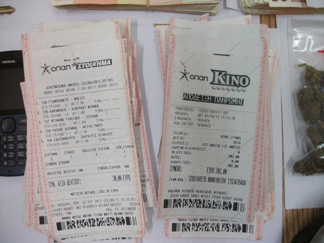 Επιπλέον, κατασχέθηκαν 78 δελτία στοιχηματισμού Ο.Π.Α.Π., μετά των αποδείξεων πληρωμής, από τα οποία προκύπτει ότι η εγκληματική οργάνωση χρησιμοποιούσε τη μεθοδολογία αυτή για «ξέπλυμα» των παράνομων εσόδων από το εμπόριο των ναρκωτικών, ενώ διερευνάται και η ενδεχόμενη αξιοποίηση άλλων μεθόδων για τη νομιμοποίηση των παράνομων εσόδων τους.