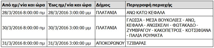 Προγραμματισμένες διακοπές ρεύματος στο Νομό Χανίων θα πραγματοποιήσει η ΔΕΗ εξαιτίας έργων συντήρησης και επέκτασης του δικτύου της.