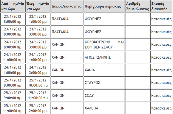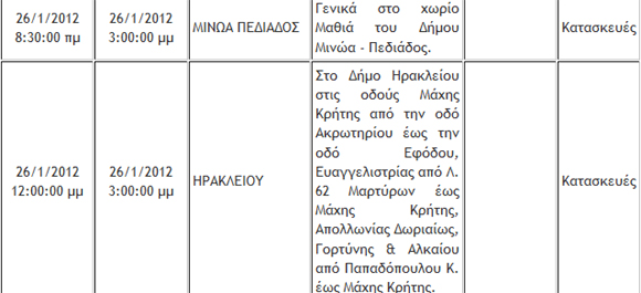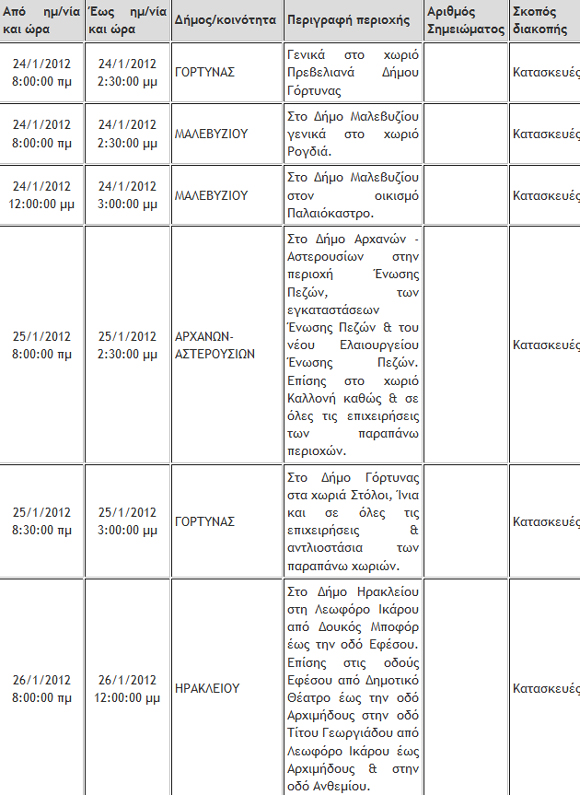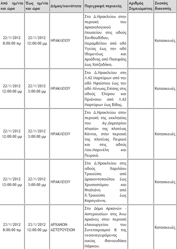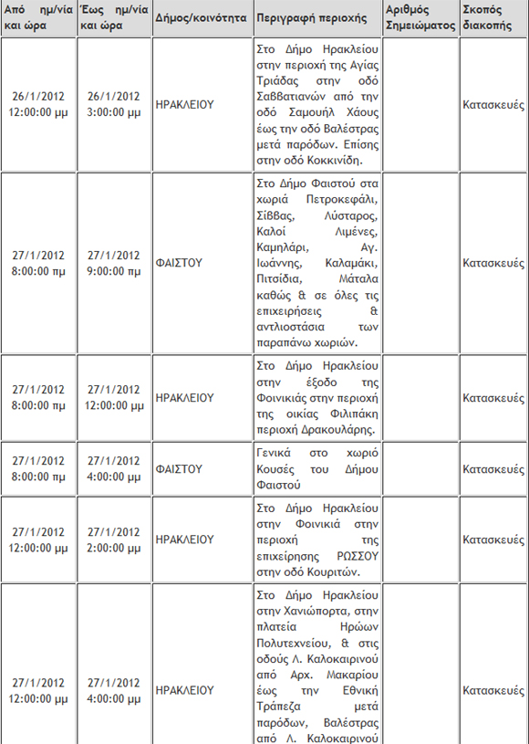 Χωρίς ρεύμα θα παραμείνουν πολλές περιοχές του Ηρακλείου και των Χανίων στην Κρήτη από την προσεχή Δευτέρα, λόγω επισκευών στο δίκτυο ηλεκτροδότησης που θα πραγματοποιήσει η ΔΕΗ.