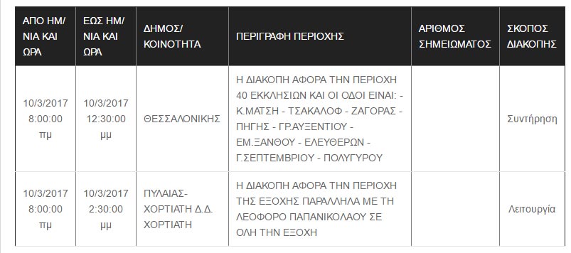 Προγραμματισμένη διακοπή ρεύματος σήμερα σε περιοχές της Θεσσαλονίκης.