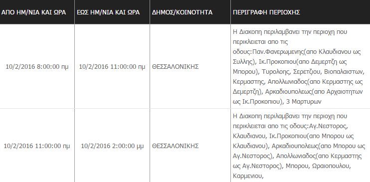 Διακοπές ρεύματος πρόκειται να πραγματοποιηθούν σήμερα σε οδούς της Θεσσαλονίκης λόγω εργασιών στο δίκτυο ηλεκτροδότησης.