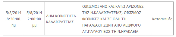 Διακοπή στην ηλεκτροδότηση θα υπάρξει σήμερα, Τρίτη 5 Αυγούστου, από τις 08.30 έως τις 14.00 το μεσημέρι, σε περιοχή...