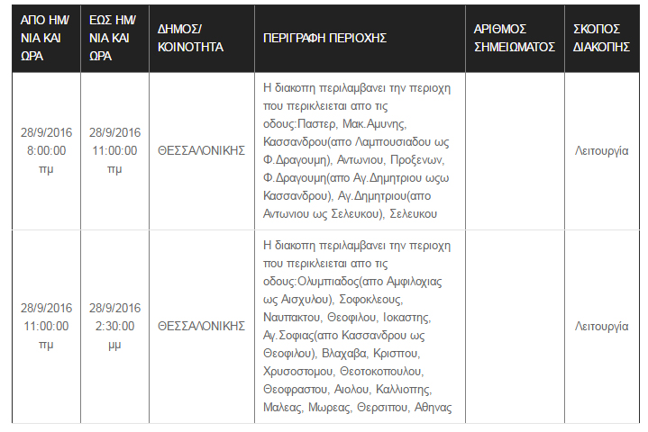 Προγραμματισμένη διακοπή ρεύματος σήμερα σε οδούς του Δήμου Θεσσαλονίκης.