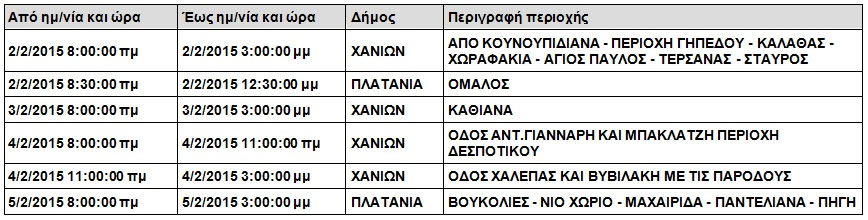 Προγραμματισμένες διακοπές ρεύματος στο Νομό Χανίων θα πραγματοποιήσει η ΔΕΗ εξαιτίας έργων συντήρησης και επέκτασης του δικτύου της.