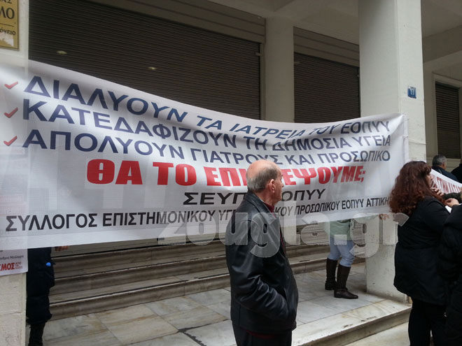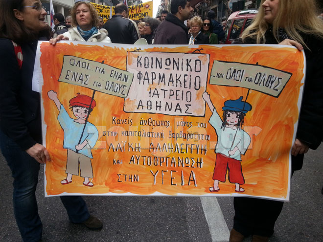 »Η κατάσταση στο χώρο της υγείας χειροτερεύει συνεχώς από τα βάρβαρα αντικοινωνικά μέτρα της μνημονιακής συγκυβέρνησης ΝΔ – ΠΑΣΟΚ. Σχεδόν ο μισός πληθυσμός της χώρας δεν έχει πια δικαίωμα πρόσβασης στις δημόσιες υπηρεσίες υγείας, καθώς οι άνεργοι φτάνουν το 30%, οι εργαζόμενοι που δουλεύουν ανασφάλιστοι αυξάνονται ραγδαία, ενώ χιλιάδες μικροέμποροι και αυτοαπασχολούμενοι έχουν μείνει χωρίς υγειονομική κάλυψη λόγω χρεών στα ασφαλιστικά τους ταμεία.