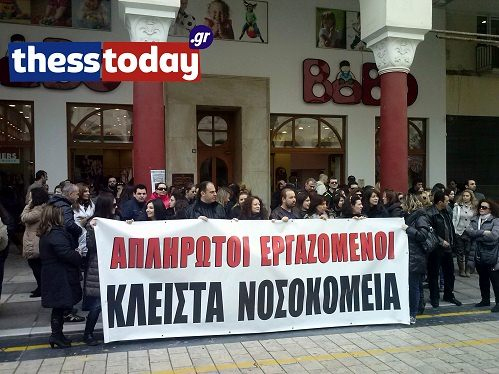 Έξω από τα γραφεία της 3ης Υγειονομικής Περιφέρειας Μακεδονίας, στην πλατεία Αριστοτέλους, έφθασαν πριν από λίγο οι εργαζόμενοι του νοσοκομείου Παπαγεωργίου, οι οποίοι διαμαρτύρονται, καθώς ακόμη δεν τους έχουν καταβληθεί τα δεδουλευμένα του Φεβρουαρίου.