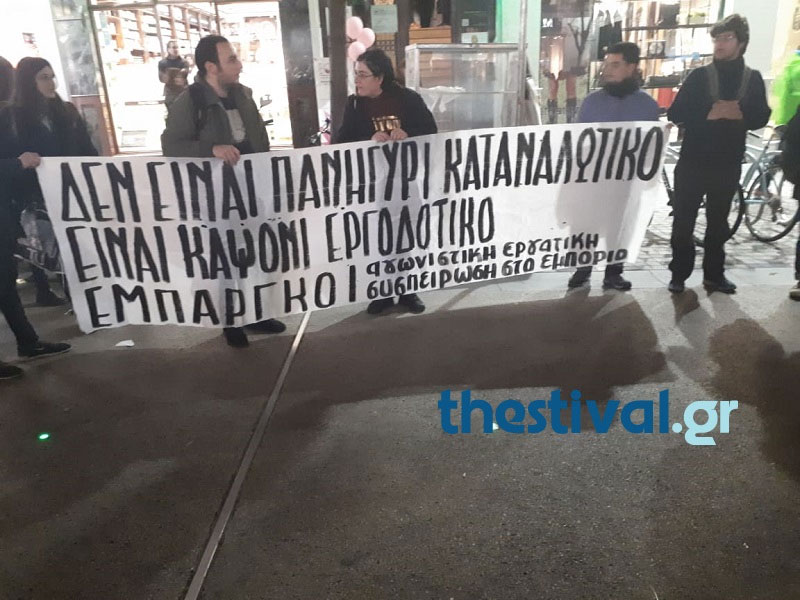 Διαμαρτυρία ενάντια στη Black Friday πραγματοποίησαν το απόγευμα της Παρασκευής στο κέντρο της Θεσσαλονίκης, μέλη του Συντονιστικού Δράσης ενάντια στην Κυριακάτικη εργασία και μέλη της Αγωνιστικής Εργατικής Συσπείρωσης στο Εμπόριο.