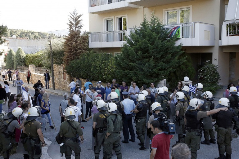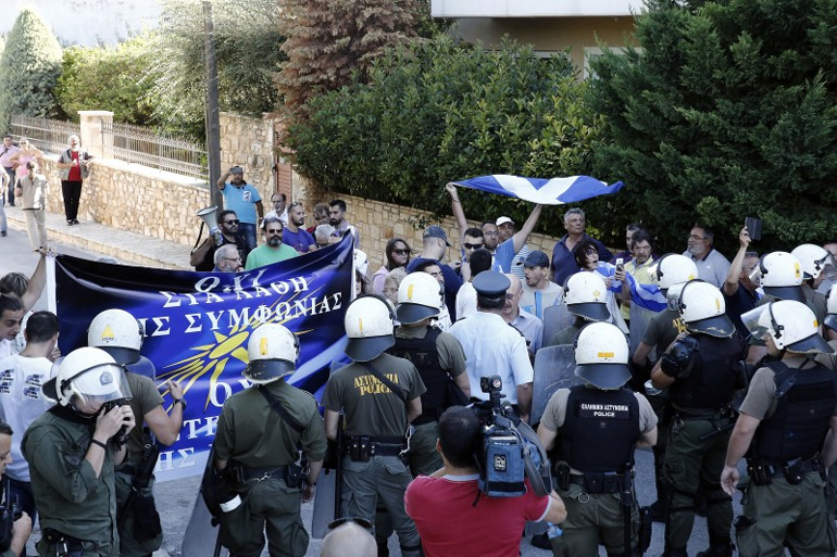 Ομάδες που τάσσονται κατά της συμφωνίας των Πρεσπών που αφορά την ονομασία των Σκοπίων συγκεντρώθηκαν έξω από εκδήλωση του ΣΥΡΙΖΑ στην Παιανία.