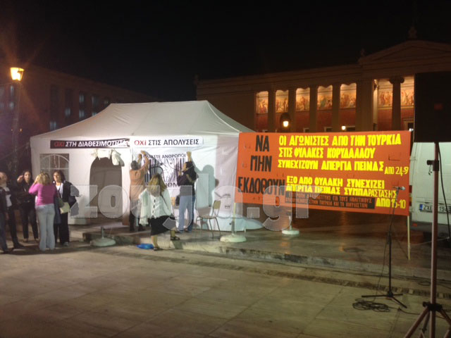 Στα Προπύλαια, διαμαρτύρονται μέλη της Επιτροπής Αλληλεγγύης στους Πολιτικούς Κρατουμένους στην Τουρκία και το Κουρδιστάν για τη μη έκδοση τεσσάρων υπηκόων Τουρκίας που κρατούνται στον Κορυδαλλό.