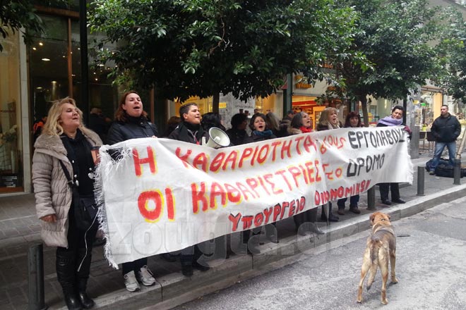 Συγκέντρωση πραγματοποιούν αυτήν την ώρα έξω από το υπουργείο Οικονομικών οι απολυμένες καθαρίστριες του υπουργείου.
