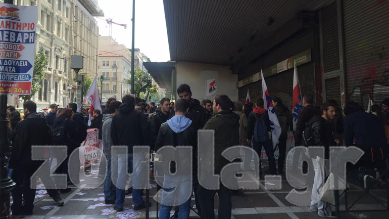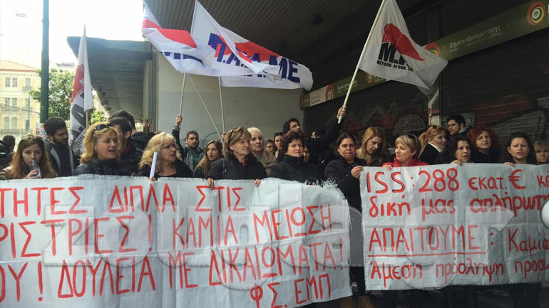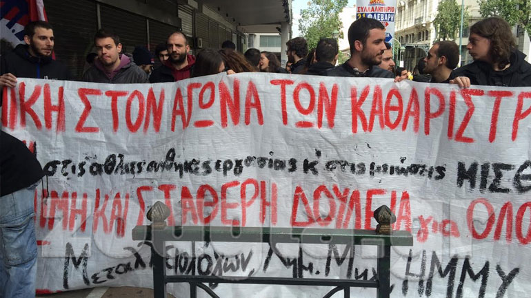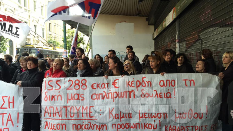 Δεκάδες καθαρίστριες του Εθνικού Μετσόβιου Πολυτεχνείου, μαζί με το ΠΑΜΕ, βρίσκονται αυτήν την ώρα στην οδό Σταδίου, έξω από το κτήριο του Υπουργείου Εργασίας, διαμαρτυρόμενες για τις μειώσεις που υφίστανται στις αποδοχές τους, ενώ ζητούν παράλληλα προσλήψεις στον κλάδο τους.