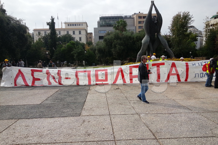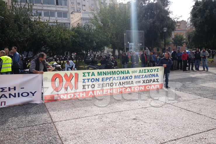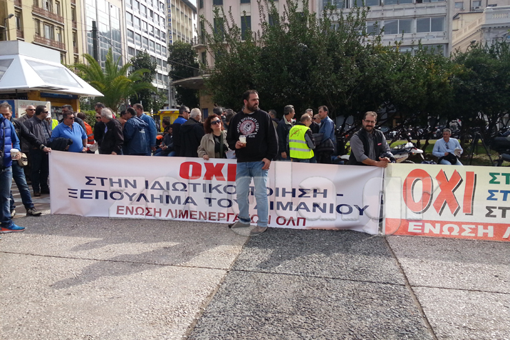 Φωνάζοντας συνθήματα και κρατώντας πανό, περίπου 200 λιμενεργάτες συγκεντρώθηκαν στην πλατεία Κλαυθμώνος και ζήτησαν μεταξύ άλλων τη διασφάλιση θέσεων εργασίας και την κάλυψη των κενών με νέο προσωπικό.