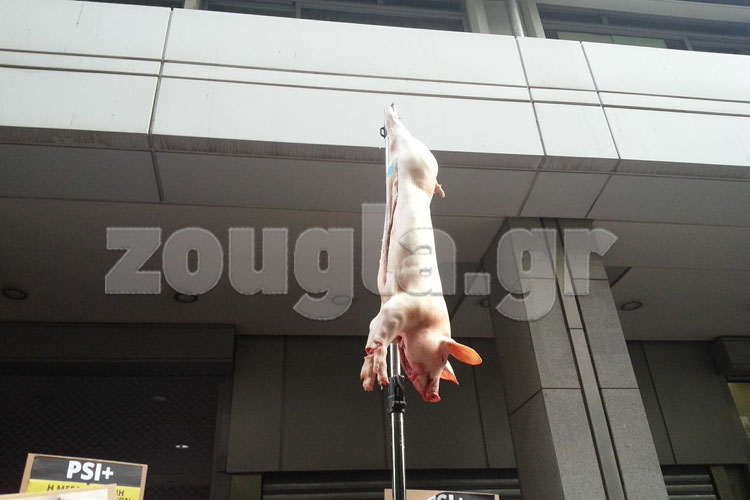 Στο πλαίσιο της σημερινής παγκόσμιας ημέρας αποταμίευσης οι διαδηλωτές κρέμασαν συμβολικά σε βάση ηχείων ένα γουρούνι.