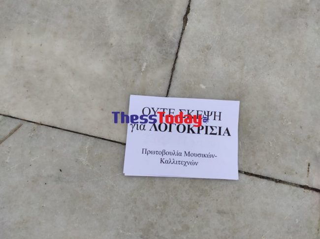 Στο άγαλμα Βενιζέλου μέλη της Πρωτοβουλίας Μουσικών Καλλιτεχνών έχουν συγκεντρωθεί προκειμένου να διαμαρτυρηθούν για τη «λογοκρισία», όπως αναφέρουν, που βιώνει η τέχνη μέσα από το νομοσχέδιο, έχοντας αναρτήσει μάλιστα και σχετικά πανό που αναγράφουν χαρακτηριστικά: «Ούτε σκέψη για λογοκρισία, κάτω ο “τρομονόμος” για τις τέχνες», με τον μουσικό και μέλος της Πρωτοβουλίας Δημήτρη Χατζηκωνσταντίνου να δηλώνει στο ThessToday.gr πως οι κινητοποιήσεις θα κλιμακωθούν και το επόμενο διάστημα. «Η κυβέρνηση δεν φοβάται μόνο τα καλλιτεχνικά έργα τα οποία θα αποτελέσουν σπίθα για μελλοντικούς αγώνες, αλλά φοβάται τους ίδιους τους αγώνες» τόνισε χαρακτηριστικά ο κ. Χατζηκωνσταντίνου.