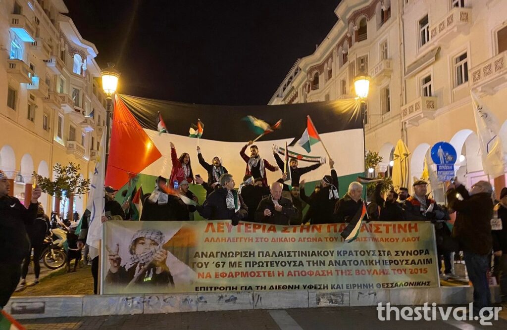 Συγκέντρωση διαμαρτυρίας στο κέντρο της Θεσσαλονίκης πραγματοποίησαν αργά το απόγευμα της Παρασκευής Παλαιστίνιοι που ζουν στην πόλη.
