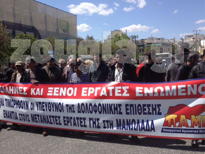 Παράσταση διαμαρτυρίας πραγματοποίησαν περίπου 50 μέλη του ΠΑΜΕ και μετανάστες έξω από το Yπουργείο Προστασίας του Πολίτη, στη Λεωφ. Κανελλοπούλου, με αφορμή τα αποτρόπαια γεγονότα στη Μανωλάδα Ηλείας.