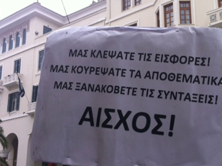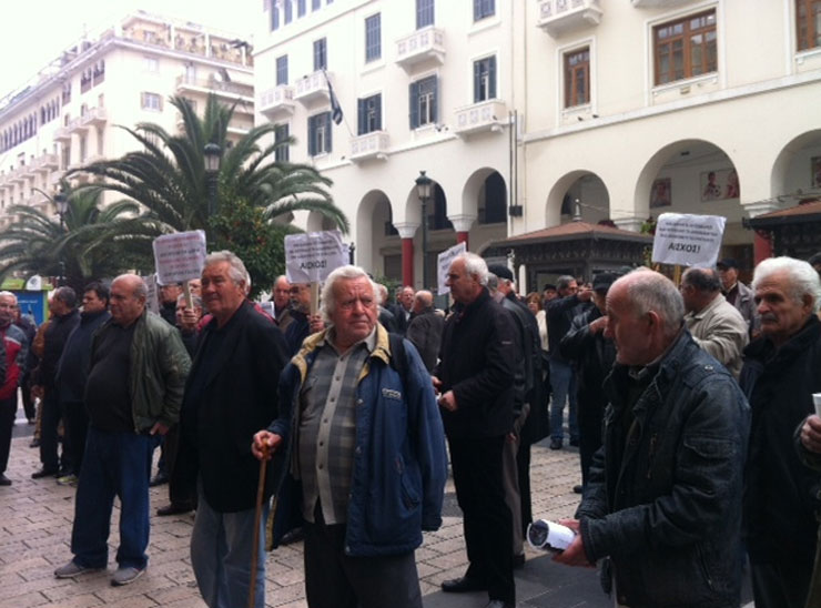 Παράσταση διαμαρτυρίας έξω από τα γραφεία του ΙΚΑ, στον πεζόδρομο της Αριστοτέλους, πραγματοποίησαν το πρωί της Τρίτης συνταξιούχοι, οι οποίοι, παραμονές Χριστουγέννων, ζητούν την άμεση καταβολή της 13ης σύνταξης.