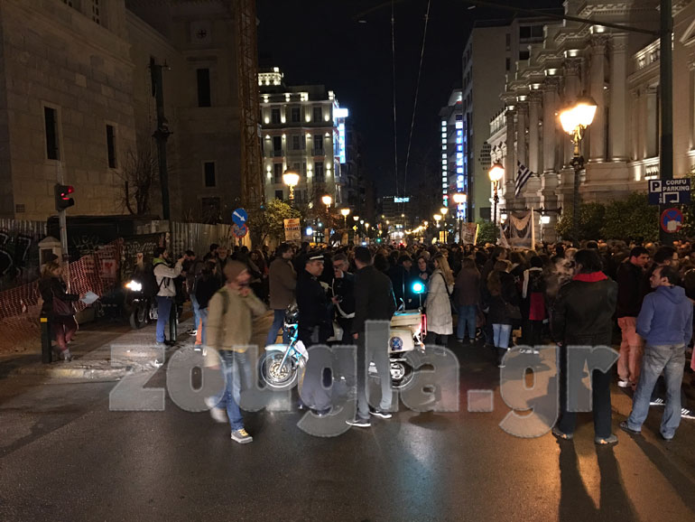 Οι συγκεντρωμένοι απέκλεισαν λίγο μετά τις 20.00 την οδό Αγίου Κωνσταντίνου.