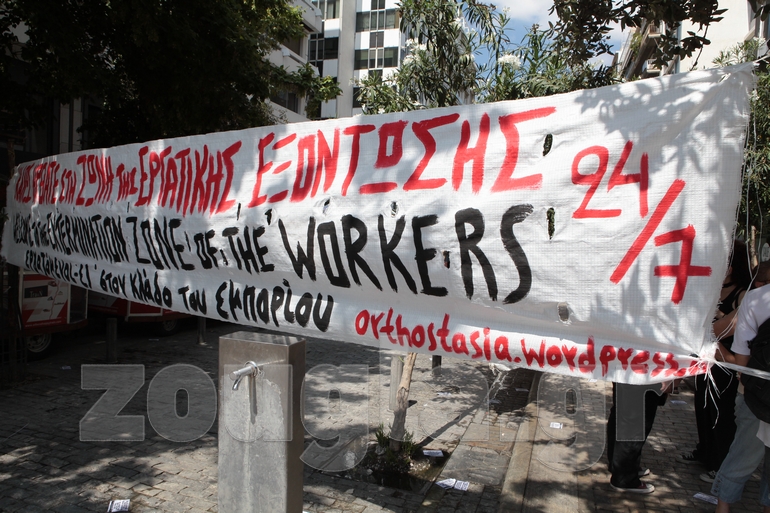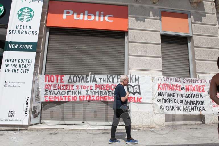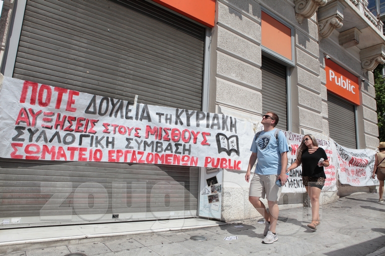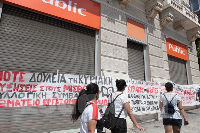 Οι εμποροϋπάλληλοι αναρτώντας πανό με συνθήματα τάσσονται κατά της εργασίας την Κυριακή.