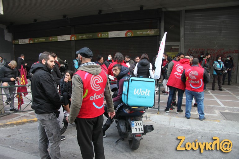 Κινητοποίηση πραγματοποιούν διανομείς και εργαζόμενοι στον Επισιτισμό στο υπουργείο Εργασίας, διεκδικώντας μέτρα προστασίας και ασφαλιστικά δικαιώματα.