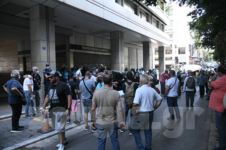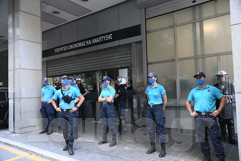 Οι εργαζόμενοι έφθασαν με πούλμαν στην Πλατεία Κλαυθμώνος και από εκεί ξεκίνησαν πορεία για το Υπουργείο Οικονομικών.
