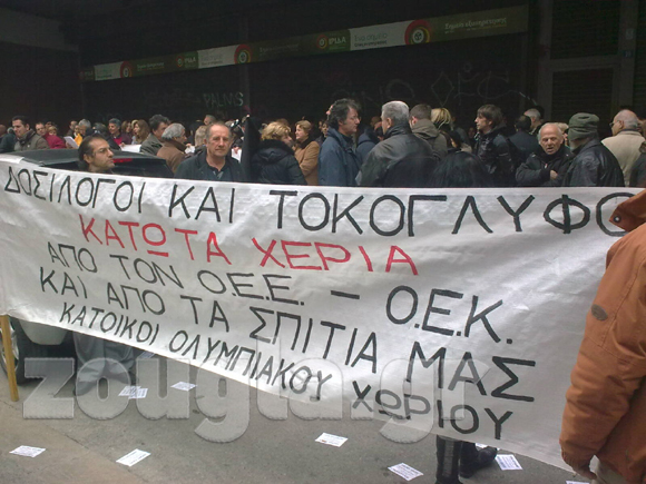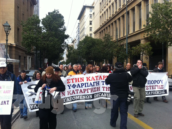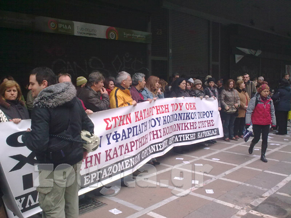 Περίπου 200 εργαζόμενοι του Οργανισμού Εργατικής Κατοικίας, του Οργανισμού Εργατικής Εστίας καθώς και εργαζόμενοι του Συλλόγου Υπαλλήλων Ασφαλιστικών Ταμείων συγκεντρώθηκαν σήμερα στην πλατεία Κλαυθμώνος και πραγματοποίησαν πορεία προς το Υπουργείο Εργασίας στην οδό Σταδίου, όπου και παρέμειναν για αρκετή ώρα διαμαρτυρόμενοι για το κλείσιμο των Οργανισμών, αλλά και για τις μειώσεις στους μισθούς και τις συντάξεις.