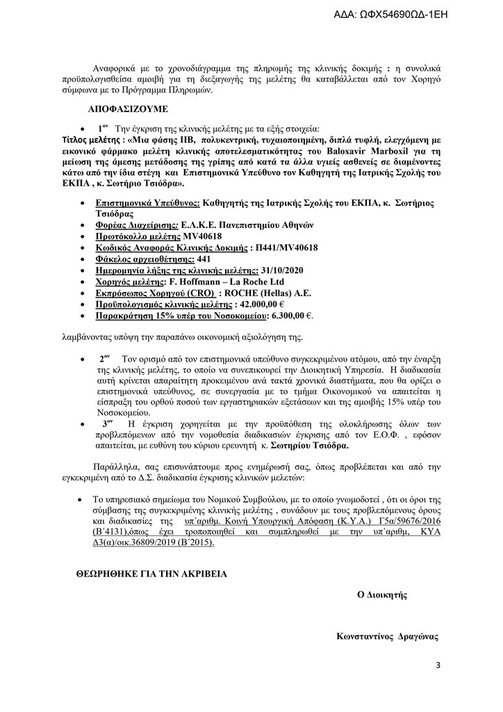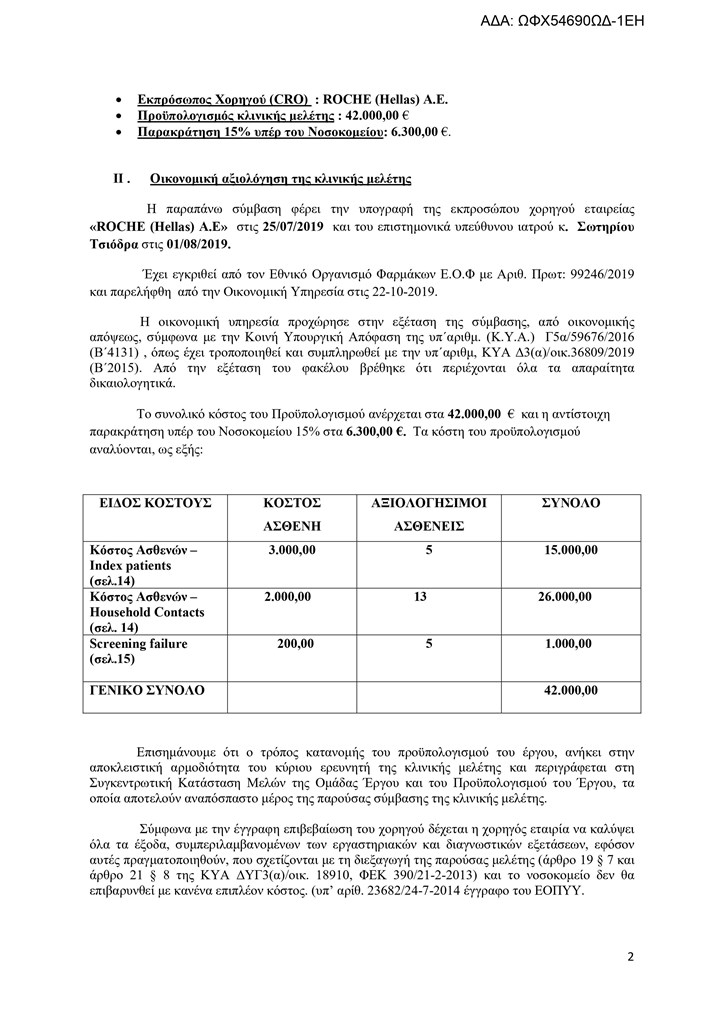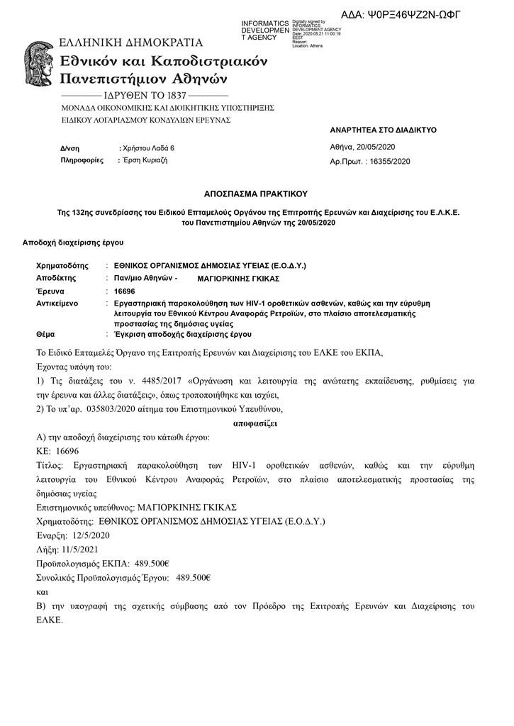 485.000 ευρώ για την «Εργαστηριακή παρακολούθηση των HIV-1 οροθετικών ασθενών, καθώς και την εύρυθμη λειτουργία του Εθνικού Κέντρου Αναφοράς Ρετροϊών, στο πλαίσιο αποτελεσματικής προστασίας της δημόσιας υγείας».