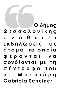 Άτομα τα οποία γνωρίζουν πρόσωπα και καταστάσεις, μιλώντας στην ηλεκτρονική εφημερίδα, αναφέρουν ότι ο δήμαρχος Θεσσαλονίκης Γιάννης Μπουτάρης αναθέτει τις εκδηλώσεις του δήμου σε ανθρώπους οι οποίοι φέρονται να διατηρούν άριστες σχέσεις με τη σύντροφό του Gabriela Scheiner.