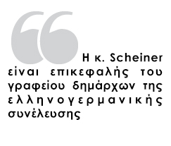 Παράλληλα, η κυρία Scheiner είναι επικεφαλής του γραφείου δημάρχων της ελληνογερμανικής συνέλευσης. Το εν λόγω γραφείο έχει αναλάβει να προωθήσει συνεργασίες ανάμεσα σε γερμανικούς και ελληνικούς δήμους.