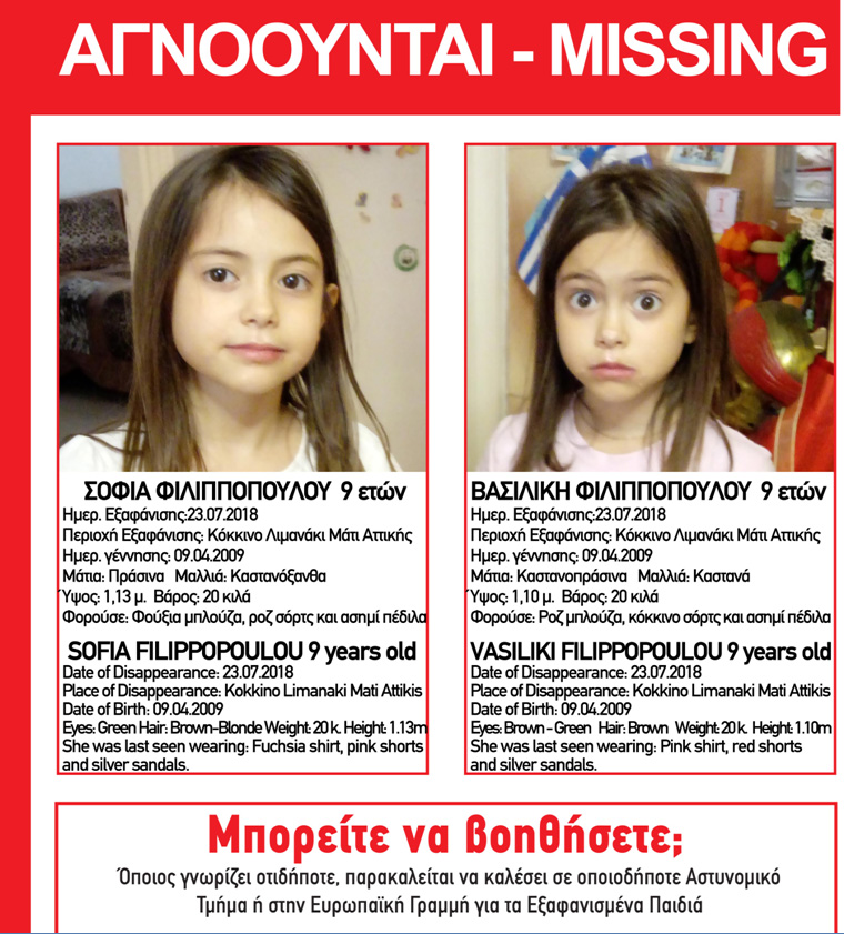 Από τις 23/07/2018, στις 18.30, οι ανήλικες Σοφία Φιλιπποπούλου 9 ετών και Βασιλική Φιλιπποπούλου, 9 ετών, αγνοούνται από το Κόκκινο Λιμανάκι, στο Μάτι Αττικής.