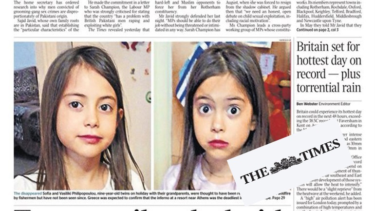 Η βρετανική εφημερίδα «Times» κυκλοφορεί με κεντρικό θέμα στο πρωτοσέλιδό της τα δύο 9χρονα κορίτσια και σχολιάζει σχετικά: «Κοριτσάκια αγνοούνται ενώ η Ελλάδα ετοιμάζεται να κηρύξει την πυρκαγιά ως τη φονικότερη μετά τον πόλεμο».