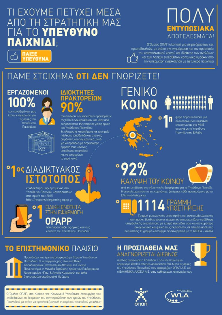 Ο Όμιλος ΟΠΑΠ επιβραβεύεται από το WLA για τον συνεπή σχεδιασμό και την εφαρμογή των αρχών του Υπεύθυνου Παιχνιδιού. Με γνώμονα τη δημιουργία ενός ασφαλούς περιβάλλοντος για τους καταναλωτές, τους εργαζομένους, και τους συνεργάτες του ο Όμιλος ΟΠΑΠ εξακολουθεί να θεσπίζει οικειοθελώς κανόνες και να αναλαμβάνει αυστηρές δεσμεύσεις, επιδιώκοντας να κρατήσει ζωντανή τη χαρά του παιχνιδιού.