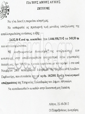 Η επίδικη έκταση –στην καρδιά της Αθήνας- είχε παραχωρηθεί στην Εκκλησία από το Δημόσιο με Βασιλικό Διάταγμα το 1952. Έκτοτε ο χώρος χρησιμοποιούταν για δημόσια χρήση, αλλά 50 χρόνια αργότερα –το 2002- η Νομαρχία κυρώνει μια Πράξη Αναλογισμού Αποζημιώσεως, σύμφωνα με την οποία προκύπτουν δικαιώματα για την Εκκλησία, η οποία και τα διεκδικεί με τιμή ανά τετραγωνικό μέτρο οικοπέδου 2.632 ευρώ, από τους παρακείμενους ιδιοκτήτες.
