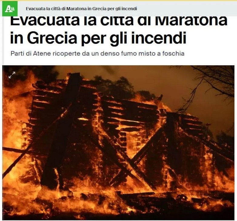 «Εκκενώθηκε η πόλη του Μαραθώνα στην Ελλάδα λόγων πυρκαγιών», μεταδίδει το ιταλικό πρακτορείο, αναφέροντας ότι «περιοχές της Αθήνας έχουν καλυφτεί από πυκνούς καπνούς».