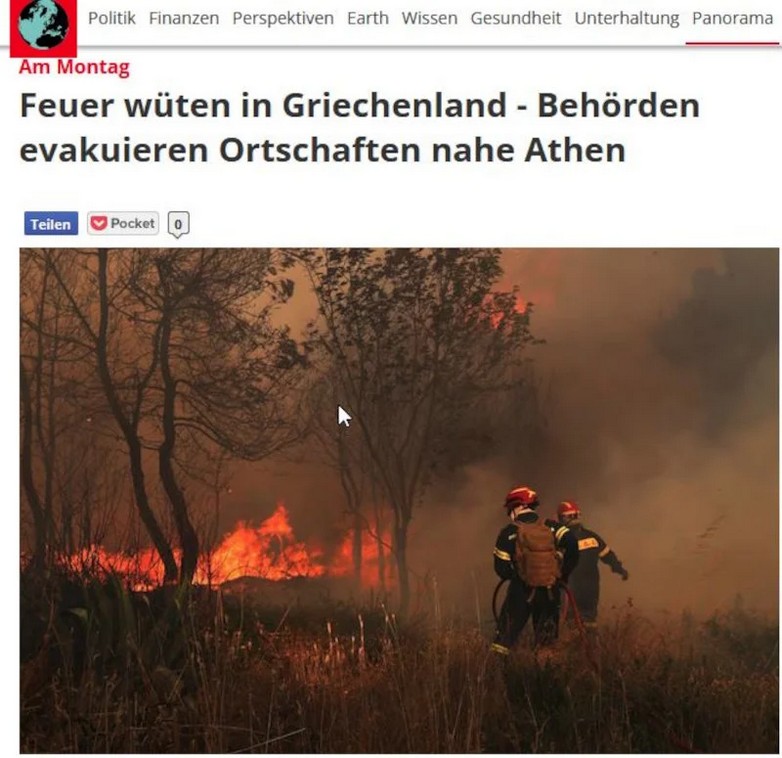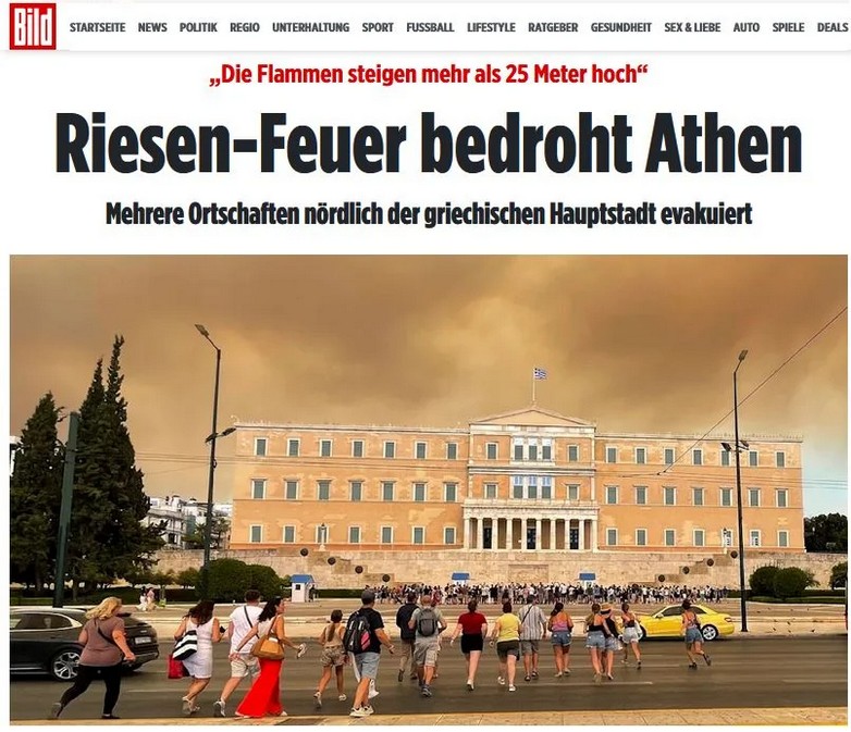 «Πυρκαγιές στην Ελλάδα – Εντολές εκκένωσης σε πολλές περιοχές κοντά στην Αθήνα», γράφει το γαλλικό πρακτορείο ειδήσεων (AFP). «510 πυροσβέστες και 152 οχήματα και 29 αεροπλάνα» της Πυροσβεστικής έχουν ριχθεί στη μάχη της κατάσβεσης των πυρκαγιών στη βορειοανατολική Αττική, με την υπηρεσία Πολιτικής Προστασίας να διατάζει την εκκένωση πολλών περιοχών, ανάμεσά τους και του Μαραθώνα.
