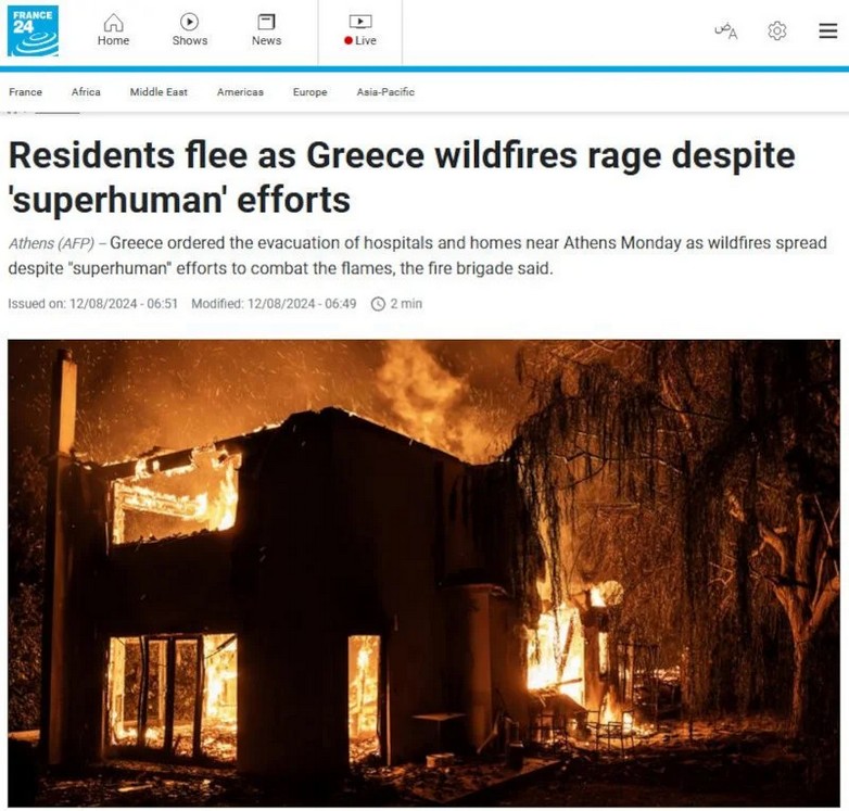 «Κάτοικοι σπεύδουν να σωθούν καθώς πυρκαγιές στην Ελλάδα μαίνονται παρά τις “υπεράνθρωπες” προσπάθειες», αναφέρει το France24.