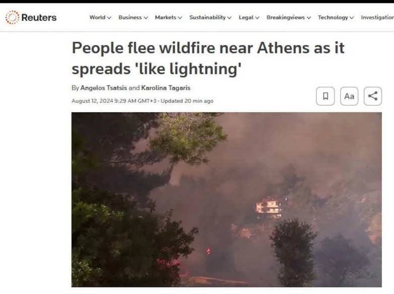 «Άνθρωποι σπεύδουν να απομακρυνθούν από πυρκαγιές κοντά στην Αθήνα καθώς εξαπλώνονται “σαν αστραπή”», αναφέρει το Reuters.