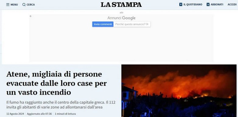 Η ιταλική εφημερίδα σημειώνει ότι «οι καπνοί έχουν φτάσει στο κέντρο της ελληνικής πρωτεύουσας. Το 112 καλεί τους κατοίκους διαφόρων περιοχών να απομακρυνθούν».